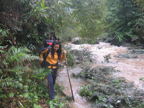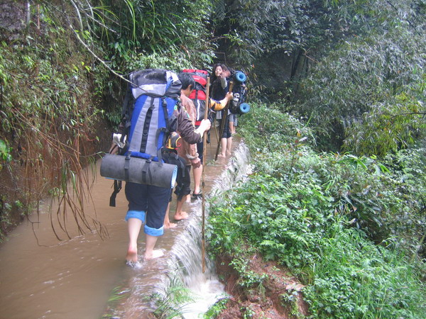 早上起来出发是发现昨天晚上的暴雨已经把桥冲毁,小春和当地的邓老师忙着搭桥.