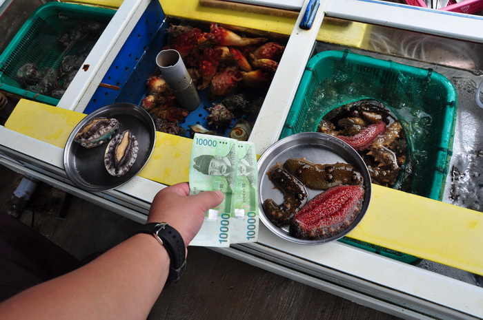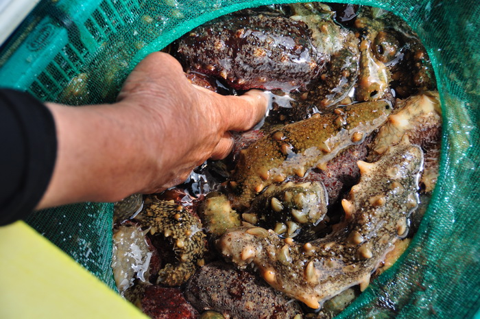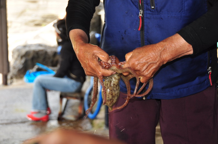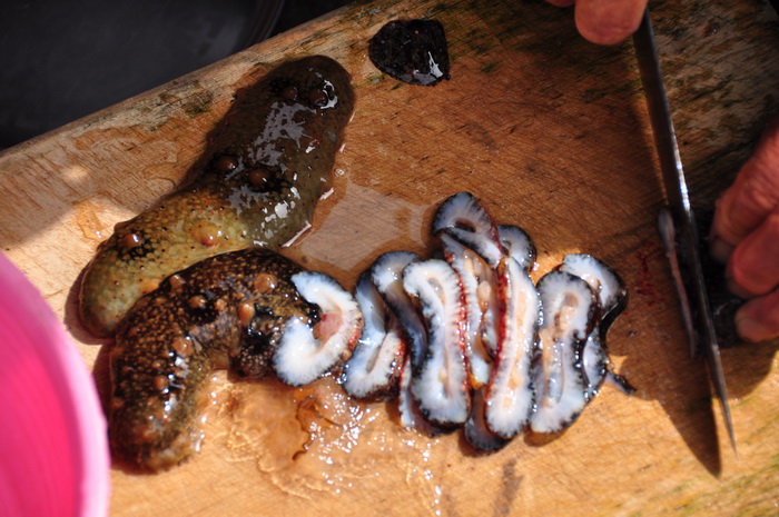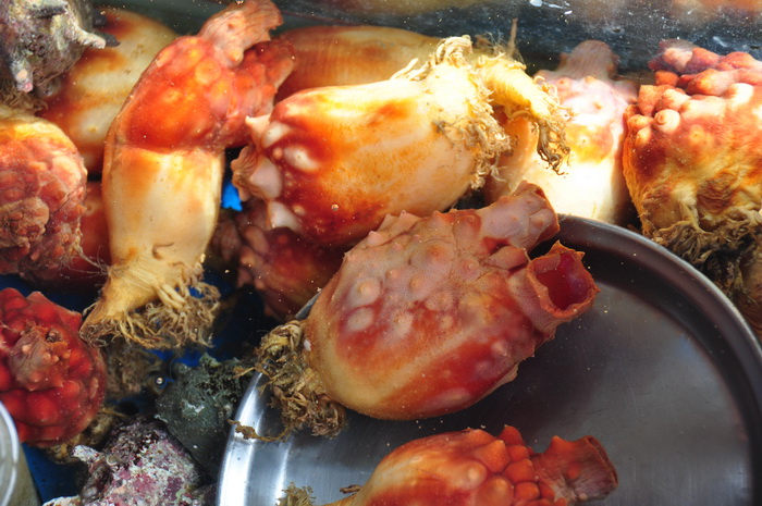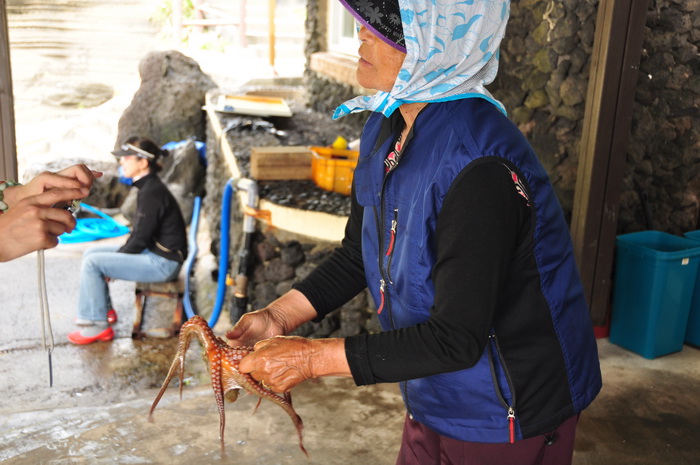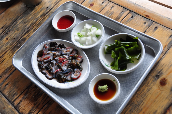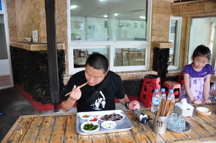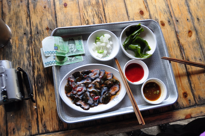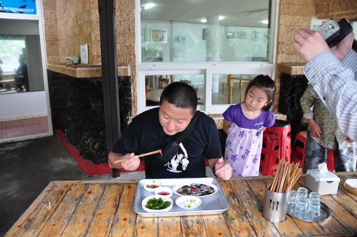 济洲岛还有个世界上唯一出产的东西---红海参。从海里涝起来后直接切成段,生的沾芥末吃,味道很不错,只是有的人不敢吃。但是有点硬和脆。据说是壮阳的。每份20000元韩币