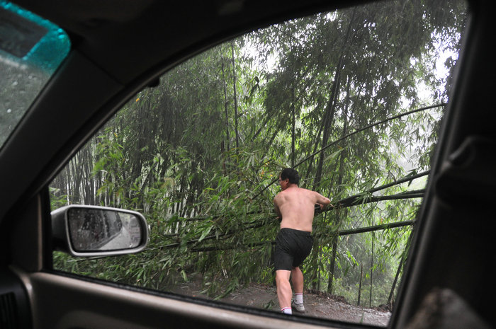 暴雨顷刻而至,狂风大作。前面公路被刮倒的竹子挡做,作为前车,波波奋勇冲进雨中,排除障碍,恢复交通。