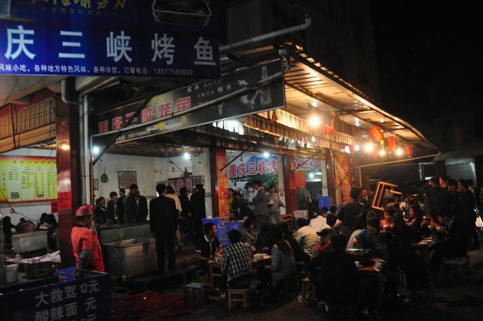 今天晚上去好吃街,刚进街口,就看到写着“撒撇”的食摊,摊位上站着一位傣族服饰的妇女,不知这两个字和食摊有着怎样的关系,就凑到近前仔细打量,傣族妇女的普通话也没听懂,买的什么也没搞清,只是懵懵懂懂地知道这两个提手旁的字和吃食有关,于是,我这会享受的美食家就多了一份心思,多了一双眼睛,满大街地寻觅“撒撇”的出现,探寻“撒撇”的究竟。二次见到“撒撇”时,有几位美女正在享用,一碗粉丝,一碗作料,一盘手撕牛肉,当时的注意力都在手撕牛肉上,根本没意识到那就是一直寻觅的“撒撇”,还以为是云南的过桥米线之类的吃食。 “撒撇”这吃食成了我的念想,马上去买了一份来,一盘雪白的米线,上面摆着一层手撕牛肉和卤牛干。一碗浓浓的作料,里面绿色的韭菜碎、茴香碎、青椒碎,红色的辣椒碎,黄色的芝麻,褐色的花生碎,满满地盛在碗里。加一筷米线,放在作料中,再送入口中,哦,酸、辣、麻、苦、涩,五种味道浓烈地冲击味蕾在口腔扩散,形成强烈的刺激和震撼,之后,待味蕾适应之后,浓的化不开的香,五味杂陈的香,奇异不俗的香,再次感染味蕾传染口腔,直到肠胃,令人大汗淋漓,红光满面,口舌生津,食指大动,痛快得想高声地喊一嗓子,用声音,把美食的快感传播出去,告诉人们“撒撇--撒撇--撒--撇------”。