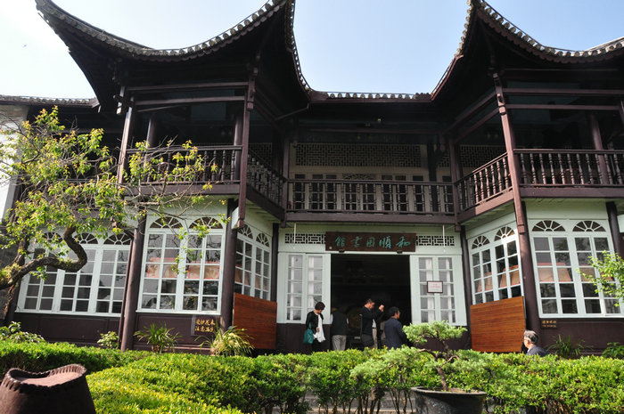 步入大门,登石级而上,至西式造型的平顶拱形中门,门额悬胡适先生题书馆名。中门内为花园,园内花木扶疏,布局典雅。穿过花园即达馆舍主楼,主楼为二层五开间木结构楼房,正面两侧突出两个半六角亭,建筑立面玲珑别致,门窗造型西式设计,建筑结构新颖,气宇轩昂。主楼后为藏书楼。