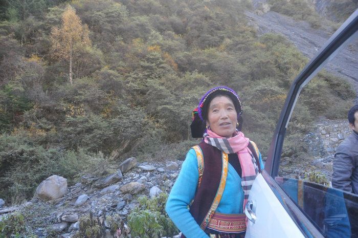 我开始以为沟里有好漂亮的美景,结果是大妈带我们去看他们的山神,身手矫健的大妈在崎岖的路上轻松跳跃,我左手摄像机、右手照相机,连滚带爬地跟在后面,来到一座山石前,指着说这就是他们的山神,天旱的时候他们就来求雨,然后就有雨下。石山前面围可以看见很多经幡。原来这是人家最尊敬的神,也是人家的图腾,怪不得非要喊大家的看看,还要一定拍照留念。人家是要我们分享他们的敬畏,生活中不怕天不怕地没有敬畏的人才是最可怕的。