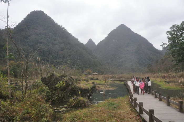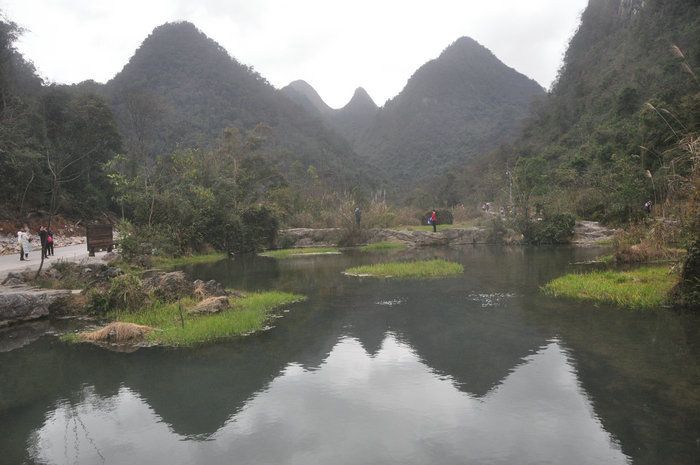 卧龙潭,原名翁龙潭。喀斯特暗河——卧龙河的出口处。从地表看它只是卧龙河的源头,近年又从这里筑坝引水发电后入响水河,成两河的总水源。暗河从崖底涌出,潭面上不见踪影,只有坝上雪崩似的滚水瀑布,潭外流不息的渠水,才感到卧龙河在潭底翻动,潭边怪石奇树林立,古木森森,潭外水声轰鸣,雾雨蒙蒙,四周高山紧锁,水潭犹如地底深渊,即便是发洪水时,潭面也犹如镜子般平静。路旁卖竹筒饭、煮鸡蛋的小女孩为了躲避寒风,龟缩在林子里的树藤上。当然要支持孩子们的工作