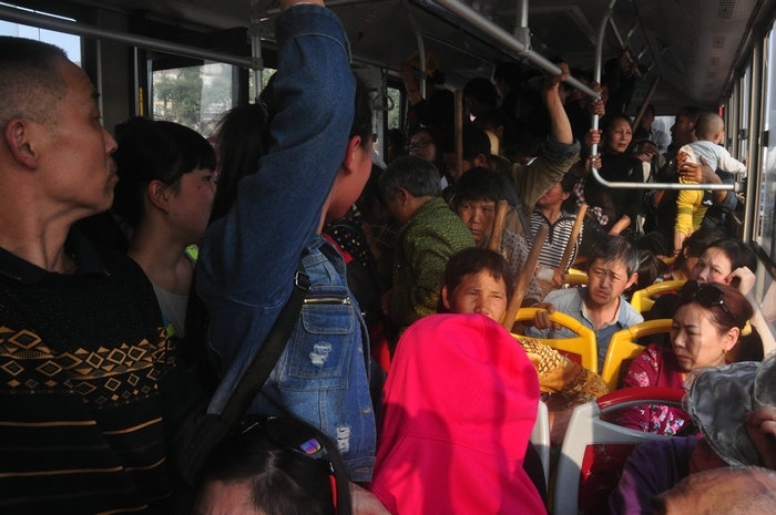 酒博会召开前忙着园林绿化的工人们下班的拥挤不下于春运