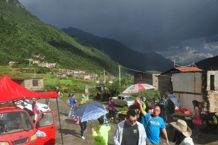 突然一片乌云飘到头顶,一场暴雨立即下来,人们忙着避雨,暴雨冲洗了花红,湿润了尘土,产生了彩虹,其实就是10多分钟,乌云过去,蓝天再现,高原气候就是如此。