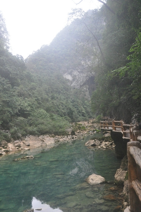 方村河伏流出露不远,有一横跨河两岸的天然巨岩,是喀斯特是貌奇观之一,谷称天生桥,又谓仙人桥。高60米,厚10多米,桥孔宽20多米,河水流过桥后,还形成2米多高的大瀑布。仰观桥孔下,只见巨型钟乳悬挂,桥脚、桥侧的裂隙石缝长出绿石草丛灌木,藤萝花卉缠裹桥身,真是满目琳琅、五颜六色的天然大彩桥。桥下瀑前水激浪涌,小船不能靠近,到此必须停船,把船扛在肩上攀登危岩,超过瀑布,又才能逆流行舟在暗河峡谷之中。此景惊险,别具一番乐趣。