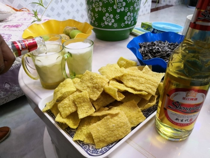 晚餐后回到我们住的农家,老板两口子又拿出水果出来招待,平时不喝酒的男主人还陪了几杯啤酒,还说明天早餐免费请我们吃,我说明天早上我们走得早,出去吃贵州的粉,就不用麻烦专门起来给我们做吃的了,谢谢了,老板娘一听,连忙说那我马上去给你们炸点本地特色荞片来尝尝,一会儿功夫,香脆可口的荞片送上来了,味道有点像虾片,多点粮食香味,非常适合下啤酒。但是住在离我们这里几百米远的另外一个农家乐的妹妹两家人就没有这样的待遇了,她们今天还被老板加价住宿,看来她们住的那家老板不厚道。回泸州后,接下来的时间,我们住这家老板的电话号码在我微信里发出后,老板的生意异常兴隆,在微信里说感谢我的推广宣传,顺便告诉大家贵州乌蒙大草原代老板农家乐的电话15285802217,要去的自己联系,吃牛肉一定要认准火娃哪家哦。