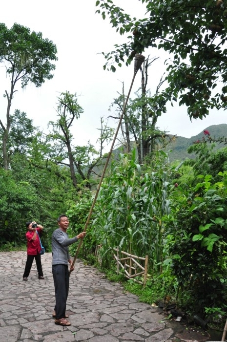 居民都很热情,门前就是梨树,成熟的梨子挂满枝头,但是梨树太高,手又够不着,想吃梨子怎么办?当地人有的是办法,这个梨一点都不酸,太新鲜了。